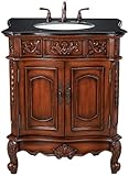 Exquisite detail is topped with black marble for an impressive effect. An off-white porcelain sink is included along with antique gold finished door pulls. An interior shelf with a cut-out section for plumbing allows for extra storage space. The walnut finish highlights the scalloped apron, acanthus leaf topped curled feet, and carved front leaf detail. Please note that neither the faucets nor tubing is included. Holes for the faucet are set at an 8" spread.